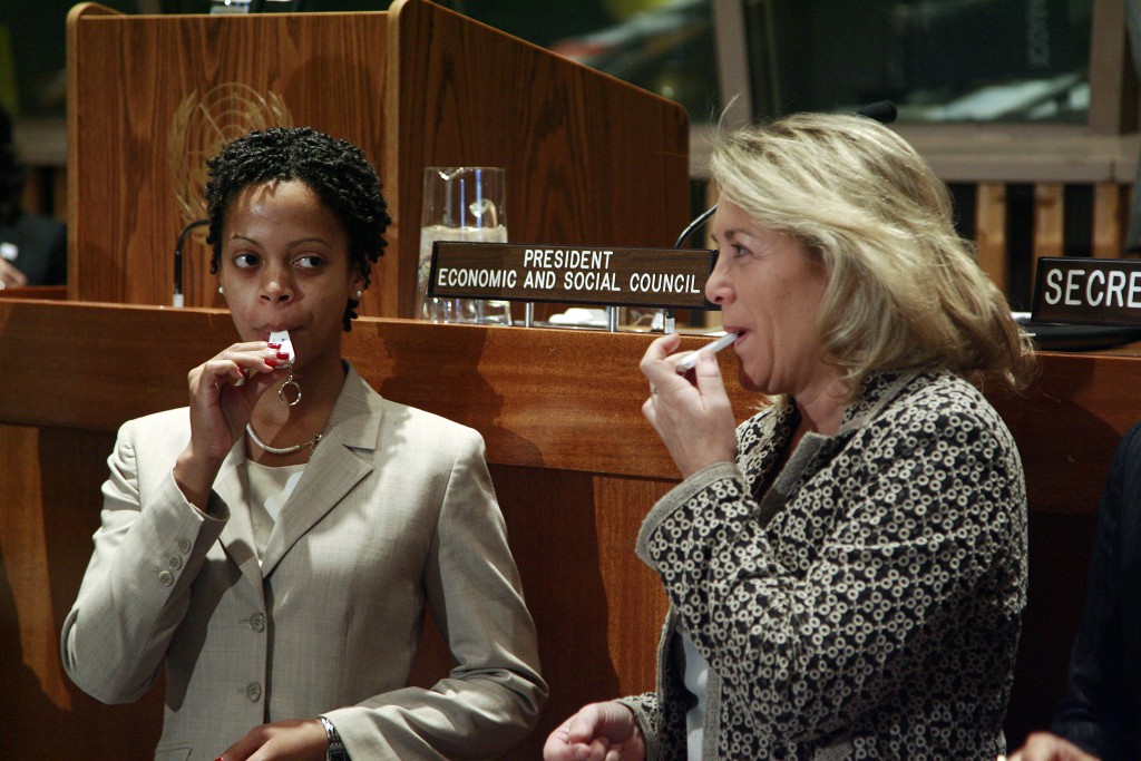 Michealene Risley från Stop Violence Against Women och en ungdomsdelegat blåser i visselpipor för att markera starten på Campaign to End Violence Against Women, 2008 (UN Photo/Mark Garten)