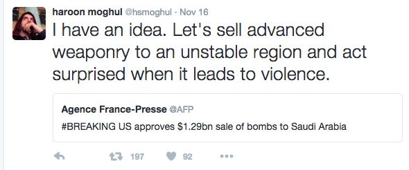 Men samtidigt som Fisk talar om betydelsen av rättvisa rapporteras det att USA godkänt en miljardförsäljning av bomber till Saudiarabien, regionens strängaste diktatur tillika hem till Wahabism, en strikt fundamentalistisk riktning inom sunniislam. Därutöver rapporterade Transparency International för mindre än en månad sedan att regionens försvarsspenderade ökar samtidigt som bristen på öppenhet och kontroller riskerar att driva på konflikter och underströk att det finns bevis på att vapen från Gulfen hamnat hos icke-statliga aktörer i till exempel Syrien. Handeln med Saudiarabien och ”Västs” stöd av vissa av regionens diktaturer medan störtandet av andra är inte populärt hos en merpart av Mellanösterns befolkning.