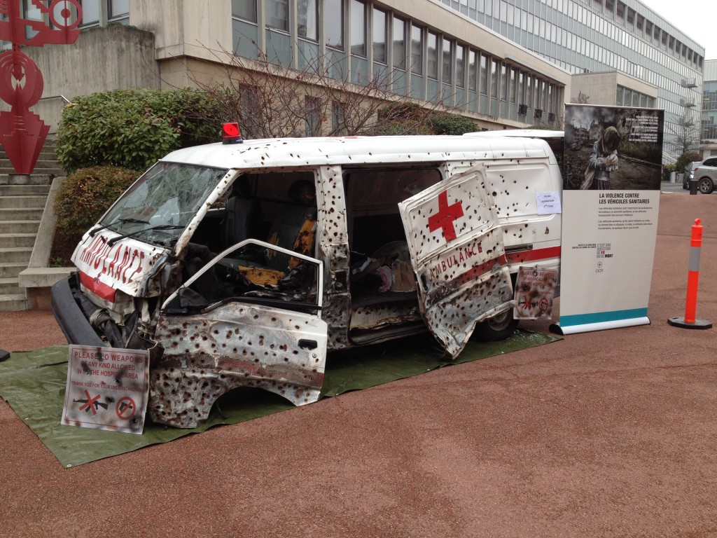 Men problemet med våld mot sjukvård har främst fått internationell uppmärksamhet när våldet riktats mot sjukvårdspersonal – och mot humanitärt bistånd – i väpnad konflikt och andra våldsamma situationer. Internationella rödakorskommittén, Internationella rödakors- och rödahalvmånefederationen, nationella rödakors- och rödahalvmåneförbunden, och alla medlemsstater som har undertecknat Genèveavtalen möts vart fjärde år på Internationella rödakors- och rödahalvmånekonferensen. I december 2015 på den 32:e konferensen var problemet högt upp på agendan, och delegater delade med sig av sina erfarenheter från vardagen. En representant från Syrien beskrev till exempel hur ambulanspersonal: inte brukar använda säkerhetsbälte när de kör i konfliktdrabbade områden, så att de kan evakuera ambulansen snabbt – och förare parkerar så att passagerna har möjlighet att fly och gömma sig bakom fordonet ifall de utsätts för bakhåll och behöver ta skydd.