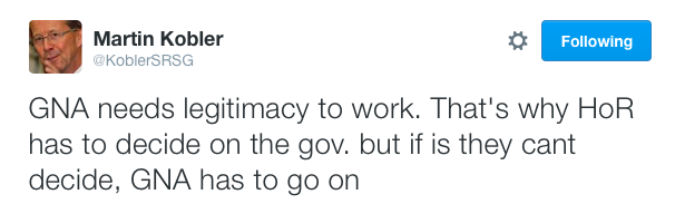 Men utan andra alternativ hoppas det internationella samfundet kunna tvinga igenom enhetsregeringen. FN: s sändebud Martin Kobbler twittrade i upptakten till enhetsregeringens (Government of National Accord, GNA) inrättande: ”GNA behöver legitimitet för att kunna arbeta.” Men tillade sedan: ”Det är därför HoR måste besluta om styret men om de inte kan besluta, måste GNA fortsätta.”