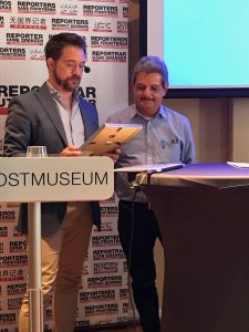 Reportrar utan gränsers ordförande Erik Halkjaer överlämnar pressfrihetspriset till den mexikanske journalisten Ismael Bojorquez.
