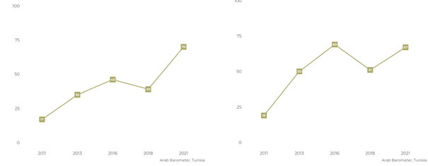 Erfarenheterna från den arabiska våren har också minskat medborgarnas tro på demokratins förmåga att lösa problem. Också här instämmer majoriteten i sju av nio länder i påståendena att demokratier är obeslutsamma och oförmögna att upprätthålla ordning och stabilitet. Återigen är det befolkningen i Irak och Tunisien som har det minsta förtroendet för demokratin, en syn som har förändrats dramatiskt sedan 2011 (Fig 1), dvs en period präglad av svikna förhoppningar.