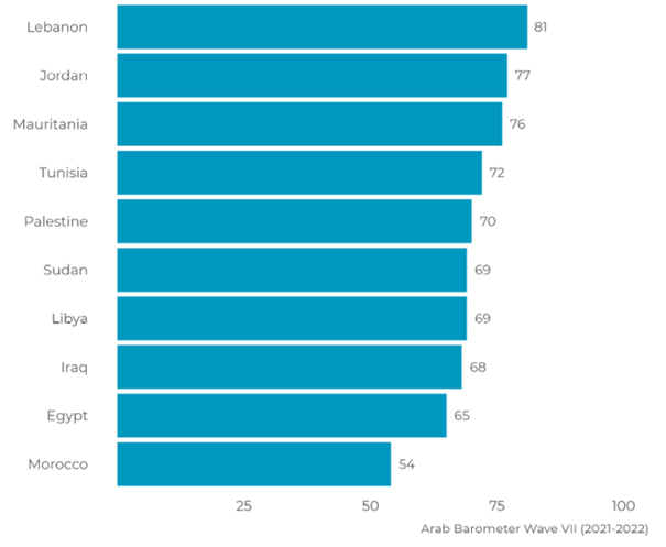 demokratiska valen i regionen sedan 2011. Sedan följer Palestina (63%) där nationella val ständigt skjutits upp sedan 2006, och Libyen (61%), där två konkurrerande regimer strider om makten och nationella val ännu inte kunnat hållas. Den negativa synen på demokratins förmåga att främja ekonomisk utveckling omfattas av alla samhällsgrupper – unga som gamla, män och kvinnor, fattiga och rika.