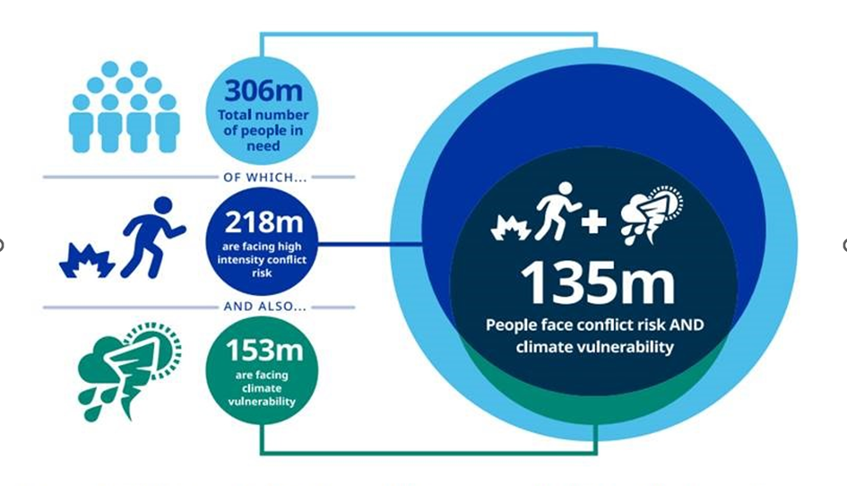Figuren visar hur klimat- och konfliktrisker överlappar i många länder och för många människor. Hämtad från Development Initiatives Global Humanitarian Assistance Report 2022