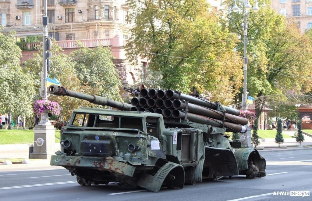 Bild: Ett förstört ryskt militärfordon ställdes ut under Ukrainas självständighetsdag 2023