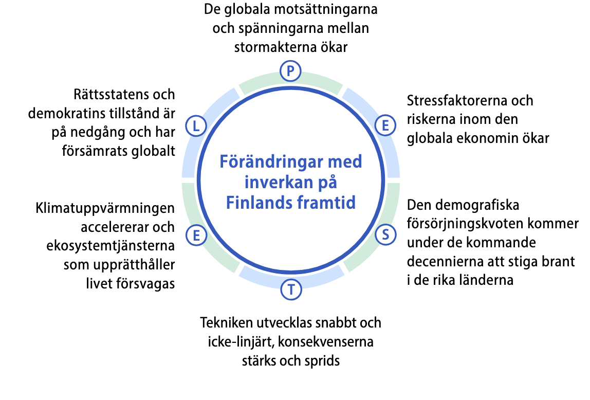 Syftet med framtidsredogörelsen är att identifiera frågor som är viktiga för beslutsfattandet och som kräver särskild uppmärksamhet i framtiden. Inledningsvis görs en omfattande analys av omvärldsförändringar som bedöms påverka Finlands framtid. I den senaste strategiska omvärldsanalysen från november 2024 har 26 geopolitiska, ekonomiska, samhälleliga, tekniska, miljömässiga och lagstiftningsmässiga förändringsfaktorer identifierats som bedöms ha en inverkan på Finlands framtid. Dessa sammanfattas och beskrivs under sex områden, se figuren nedan:
